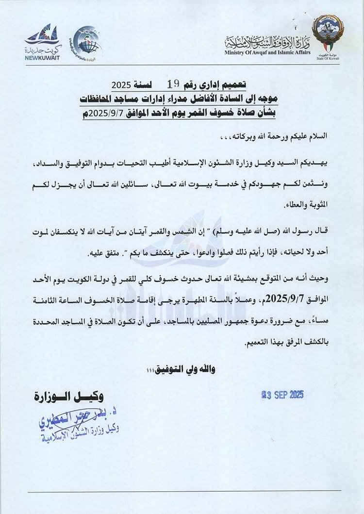 أصدر وكيل وزارة الشؤون الإسلامية د. بدر المطيري تعميما إداريا رقم 19 لسنة 2025 موجها إلى مديري إدارات مساجد المحافظات بشأن صلاة خسوف القمر يوم الأحد المقبل 7 سبتمبر، وذلك في 106 مساجد بمختلف المحافظات عملا بالسنة المطهرة.