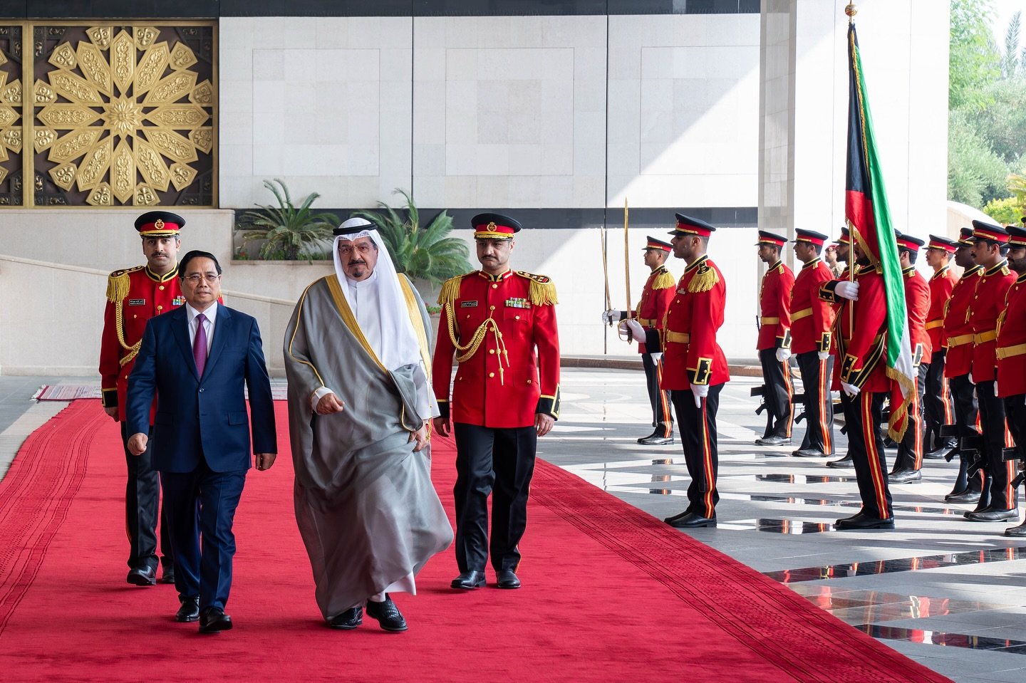 وقد جرت للضيف مراسم استقبال رسمية عزف خلالها النشيدين الكويتي والفيتنامي، قام بعدها بمصافحة كبار مستقبليه وفي مقدمتهم النائب الأول لرئيس مجلس الوزراء ووزير الداخلية الشيخ فهد اليوسف، ونائب رئيس مجلس الوزراء ووزير الدولة لشؤون مجلس الوزراء شريدة المعوشرجي، ورئيس ديوان رئيس مجلس الوزراء عبدالعزيز الدخيل، ووزير الخارجية عبدالله اليحيا، ووزير التجارة والصناعة خليفة العجيل، ووزير النفط طارق الرومي، ووزير الكهرباء والماء والطاقة المتجددة ووزير المالية ووزير الدولة للشؤون الاقتصادية والاستثمار بالوكالة الدكتور صبيح المخيزيم، والمستشار في ديوان رئيس مجلس الوزراء رئيس بعثة الشرف المرافقة الشيخ الدكتور باسل الصباح، ووكيل ديوان رئيس مجلس الوزراء الشيخ خالد الخالد، ومساعد وزير الخارجية لشؤون آسيا السفير سميح جوهر حيات، وسفير دولة الكويت لدى جمهورية فيتنام الاشتراكية يوسف الصباغ وكبار قادة الجيش والشرطة والحرس الوطني وقوة الإطفاء العام وكبار المسؤولين في الدولة.