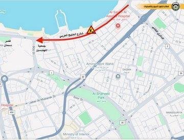 أعلنت الإدارة العامة للمرور عن إغلاق كلي لشارع الخليج العربي من تقاطع الدائري الثاني مع شارع الخليج العربي إلى تقاطع جمعية المهندسين اعتبارا من يوم الخميس الموافق 22 الجاري الساعة 6:00 مساء حتى يوم الأحد الموافق 25 الجاري الساعة 6:00 صباحا، وذلك لاستكمال أعمال الصيانة اللازمة للطريق.