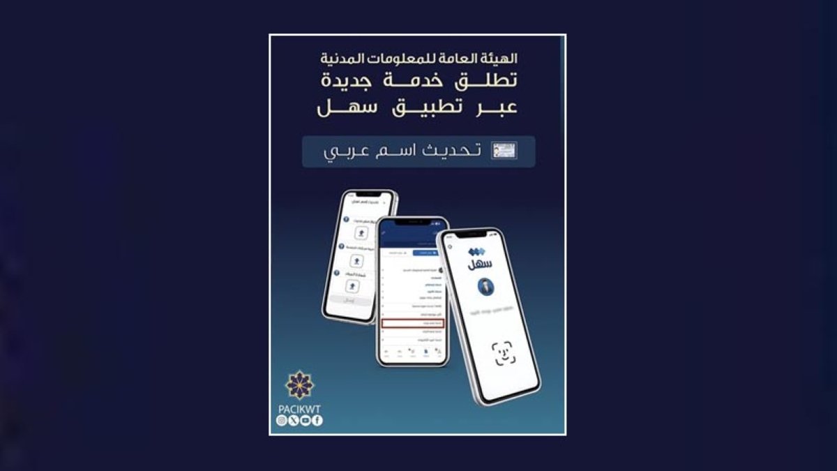 أعلنت الهيئة العامة للمعلومات المدنية عن إطلاق خدمة تحديث الاسم العربي عبر تطبيق «سهل»، وذلك لتسهيل إنجاز المعاملات، وتعزيز الاستفادة من الخدمات الإلكترونية في ظل الظروف الاستثنائية الحالية.